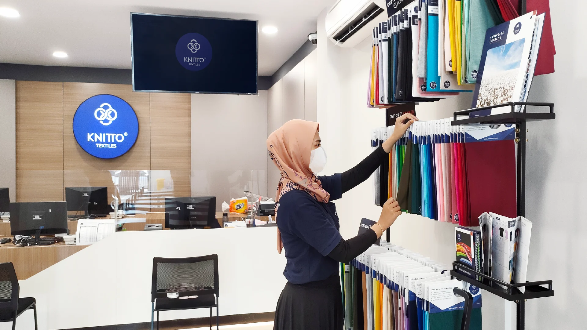 Toko bahan kaos Knitto Textiles Semarang memiliki fasilitas yang lengkap, seperti ruang tunggu ber-AC yang nyaman, dilengkapi dengan display sample handfeel dan jenis kain yang tersedia serta infographic jenis kain yang dapat mempermudah konsumen memilih kain. Store ini juga memiliki fasilitas umum seperti toilet, free wifi, dan mushola. Jangan khawatir, Knitto Textiles Semarang memiliki lahan parkir yang cukup luas.